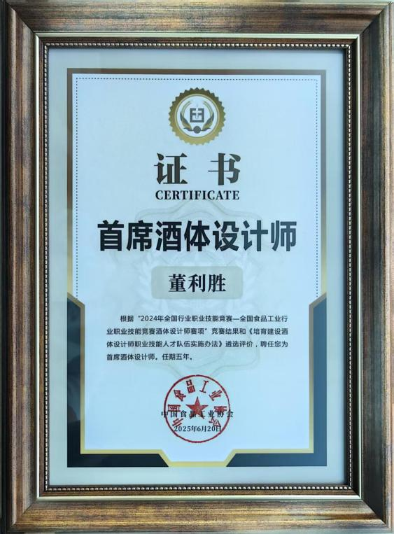 202571日至3日,在江西南昌舉行的中國食品工業(yè)協(xié)會“首席酒體設(shè)計師頒證大會暨第十屆白酒評委第二次年會”上,泰山酒業(yè)集團國家級白酒評委董利勝,憑借數(shù)十年如一日的專業(yè)堅守和卓越技藝,被授予“首席酒體設(shè)計師”稱號。這是繼6月19日山東省白酒協(xié)會頒發(fā)給泰山酒業(yè)“齊魯白酒酒體設(shè)計金獎“后又一殊榮。